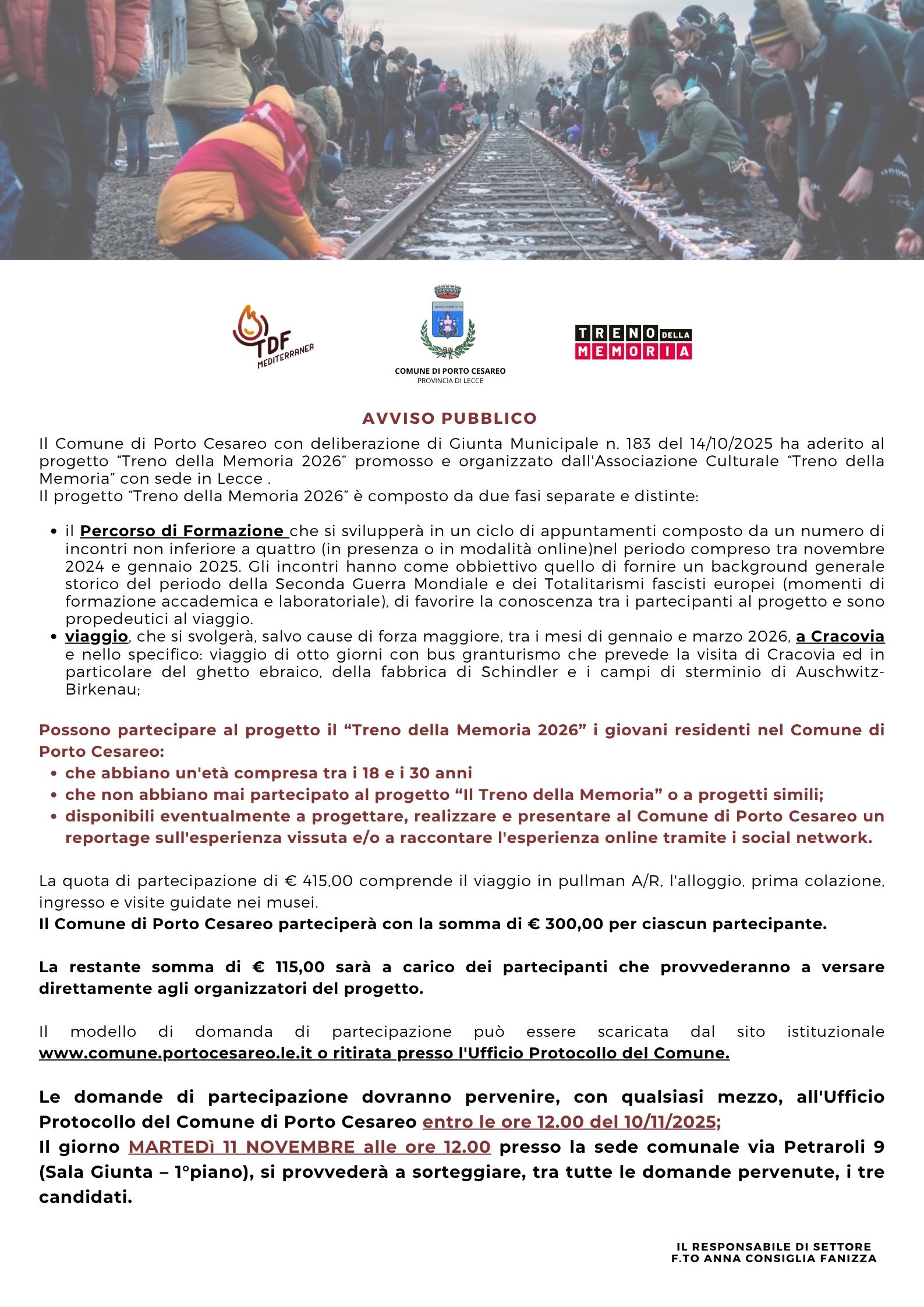 Possono partecipare al progetto il “Treno della Memoria 2026” i giovani residenti nel Comune di