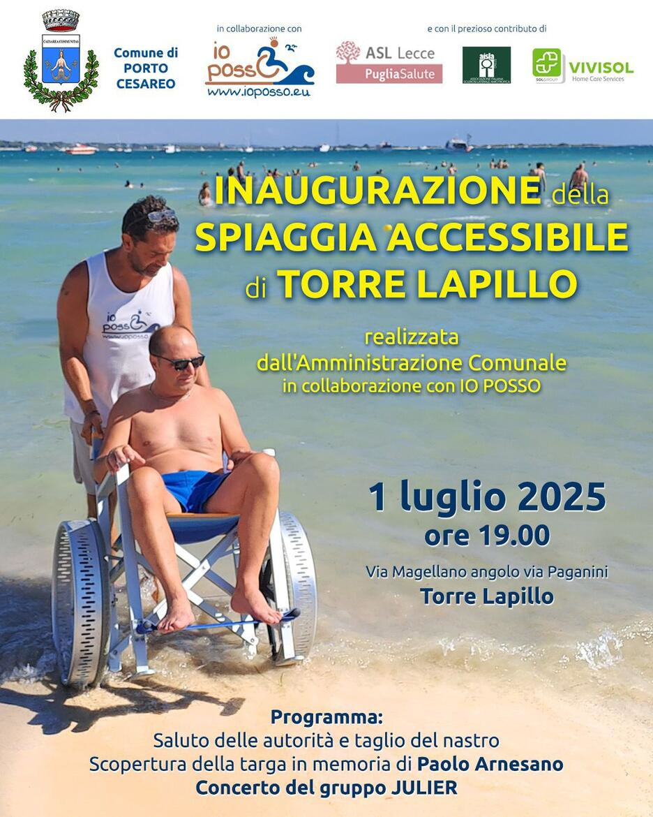 PORTO CESAREO DONATA UNA SEDIA PER BAGNANTI CON DISABILITÀ E DOMANI SI INAUGURA LA SECONDA SPIAGGIA IO POSSOFesta grande stamane a Porto Cesareo, presso La spiaggetta Io Posso, giunta alla terza estate di attività. Si è svolta infatti una vera e propria festa della solidarietà con la donazione di una sedia galleggiante per persone con diverse abilità nell'ambito del progetto Nite City for Children-Angeli di quartiere-Figli in paradiso, dotata di cinture di sicurezza. La donazione è stata possibile grazie al contributo totale di Links per la Vita"Ci siamo ritrovati presso la spiaggia che tante soddisfazioni in termini di presenze e gradimento dell'utenza ha registrato dal momento dell'inaugurazione a oggi e abbiamo ricevuto questo dono meraviglioso", commenta a caldo l'assessore al ramo Barbara Paladini, promotrice dei progetti spiagge accessibili. Un altro passo in avanti a poche ore da un momento speciale. Domani infatti Porto Cesareo e Io Posso , faranno il bis. Anche Torre Lapillo avrà il suo lido attrezzato per persone con disabilità, grazie alla ormai consolidata collaborazione con Io Posso Appuntamento alle 19:00 in via Magellano angolo via Paganini Nella località di Torre Lapillo "Un'emozione bella che non ti fa sentire la fatica, che cancella ogni difficoltà e annulla il rumore e il fumo delle critiche, quel sentimento che sa di condivisione, abbraccio, futuro.Sono piccoli sogni possibili, passi doverosi, che prendono forma e diventano realtà", commenta la sindaca Silvia Tarantino "Fabiana PacellaGiornalista Professionista