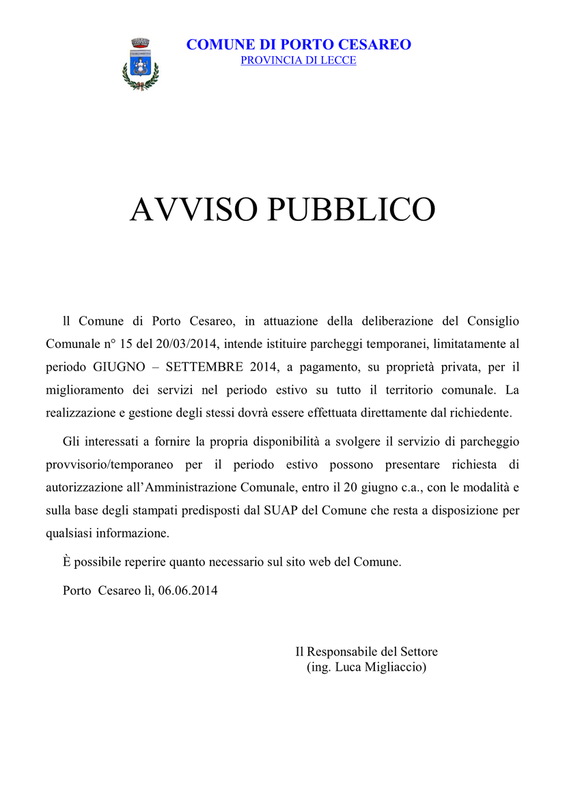 per l'acquisizione della disponibilità di privati per la gestione in proprio di aree da destinare all'uso temporaneo di parcheggio, limitatamente al periodo ...