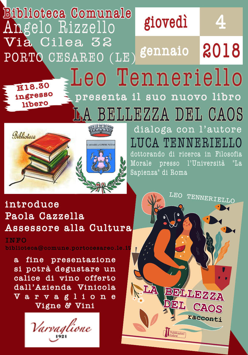 GIOVEDI' 4 GENNAIO 2018 | ORE 18,30Con noi in Biblioteca il cantautore Leo Tenneriello per raccontarci "LA BELLEZZA DEL CAOS".Introduce la serata Paola Cazzella, Assessore alla Cultura di Porto Cesareo, dialoga con l'autore Luca Tenneriello, dottorando in Filosofia morale presso La Sapienza di Roma.