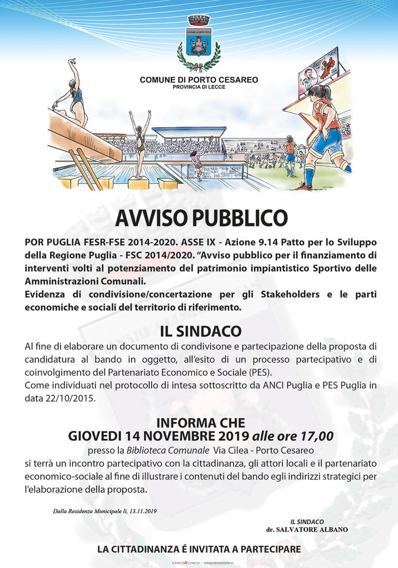 "Avviso Pubblico per il finanziamento di interventi volti al potenziamento del patrimonio impiantistico Sportivo delle Amministrazioni Comunali" Giovedì 14 novembre 2019 ore 17,00 - Incontro pubblico presso la Biblioteca Comunale in via Cilea. La cittadinanza è invitata a partecipare.