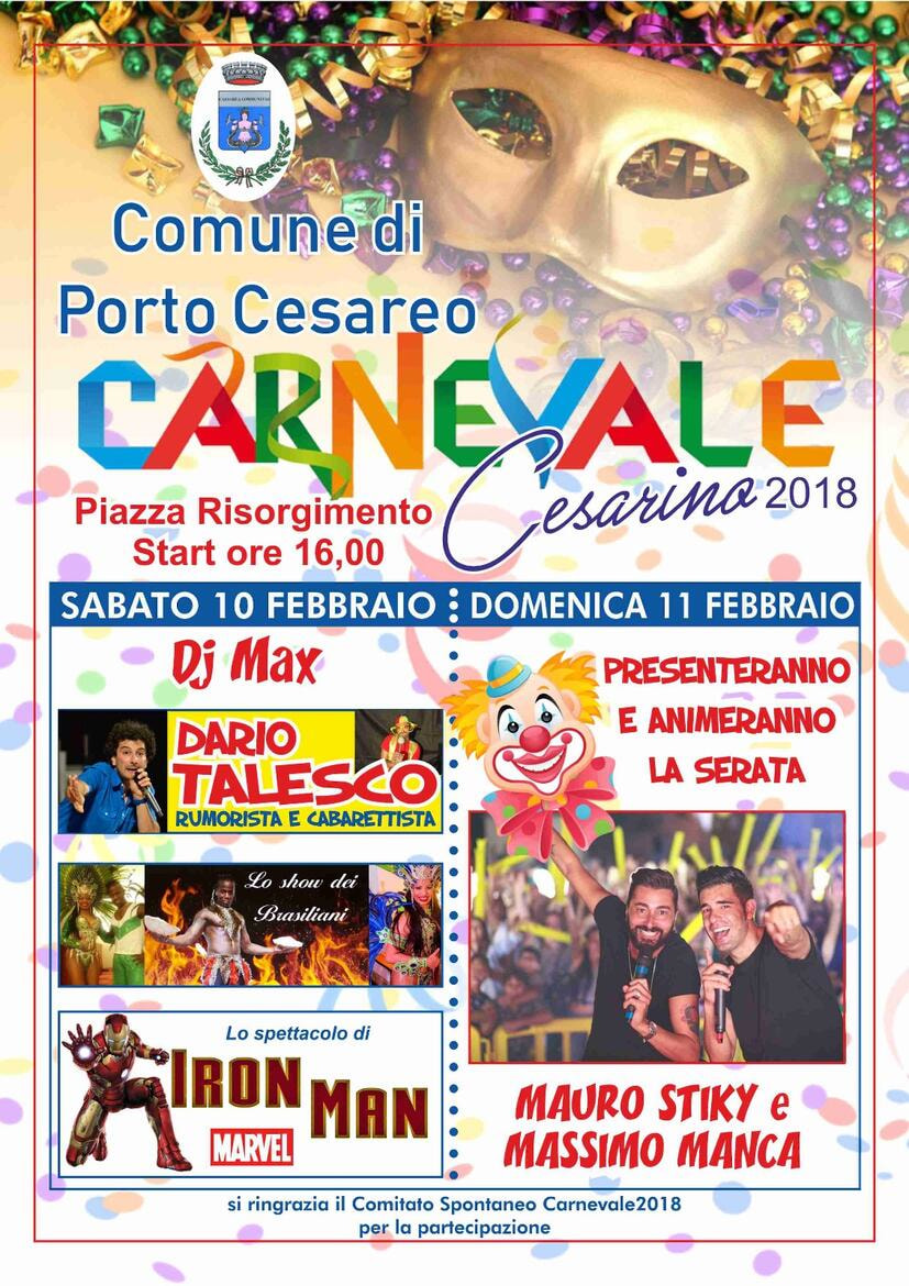 Descrizione Il Comune di Porto Cesareo organizza per sabato 10 e domenica 11 febbraio 2018CARNEVALE CESARINO 2018 Si invita tutta la cittadinanza a partecipare! Divertimento assicurato.....