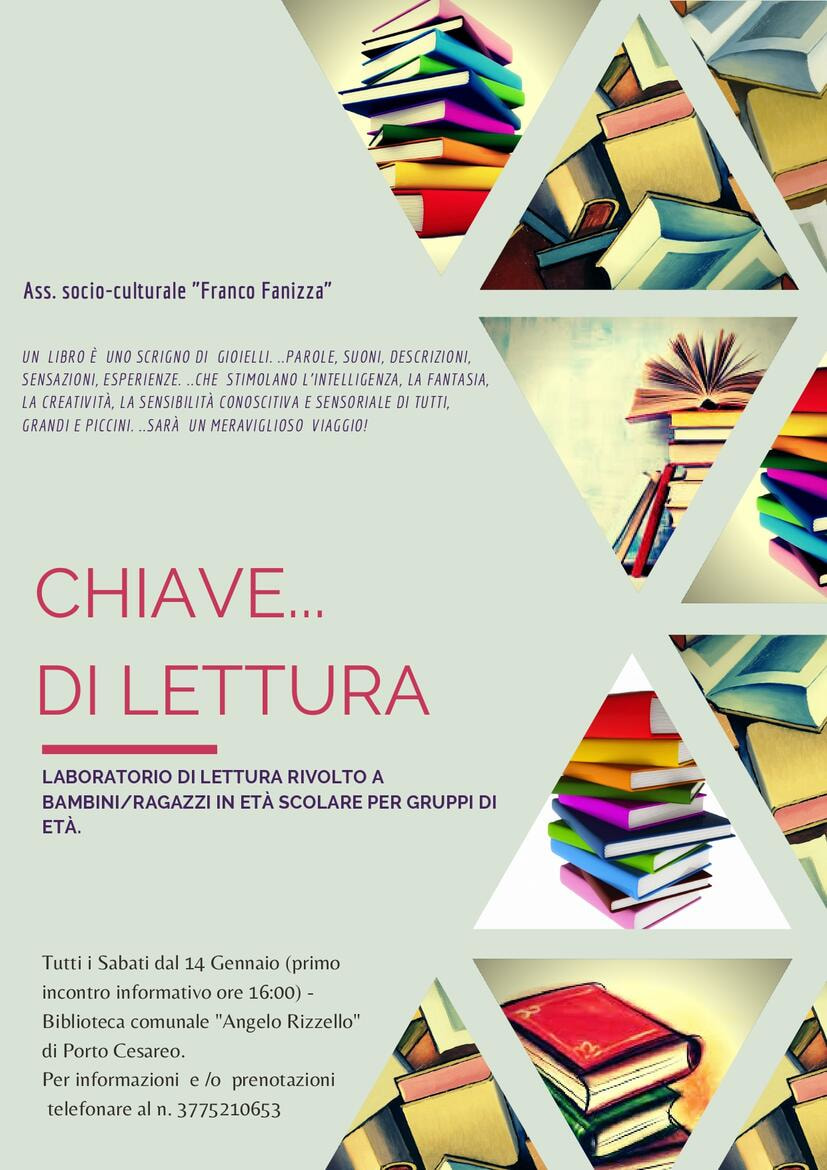 CHIAVE... DI LETTURA LABORATORIO DI LETTURA RIVOLTO A BAMBINI/RAGAZZI IN ETÀ SCOLARE PER GRUPPI DI ETÀ. Tutti i Sabati dal 14 Gennaio (primo incontro informativo ore 16:00) - Biblioteca comunale "Angelo Rizzello" di Porto Cesareo. Per informazioni e /o prenotazioni telefonare al n. 3775210653