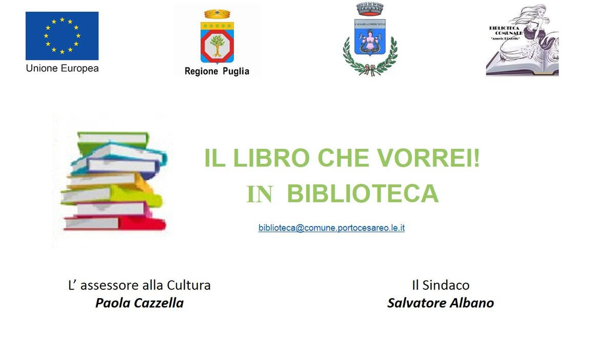 Poiché è intenzione dell’Amministrazione Comunale coinvolgere la cittadinanza nell’acquisto dei libri previsti in detto progetto, tutti i cittadini interessati sono invitati a indicare i propri “desiderata” entro il 15 Dicembre 2018 scrivendo a: biblioteca@comune.portocesareo.le.it