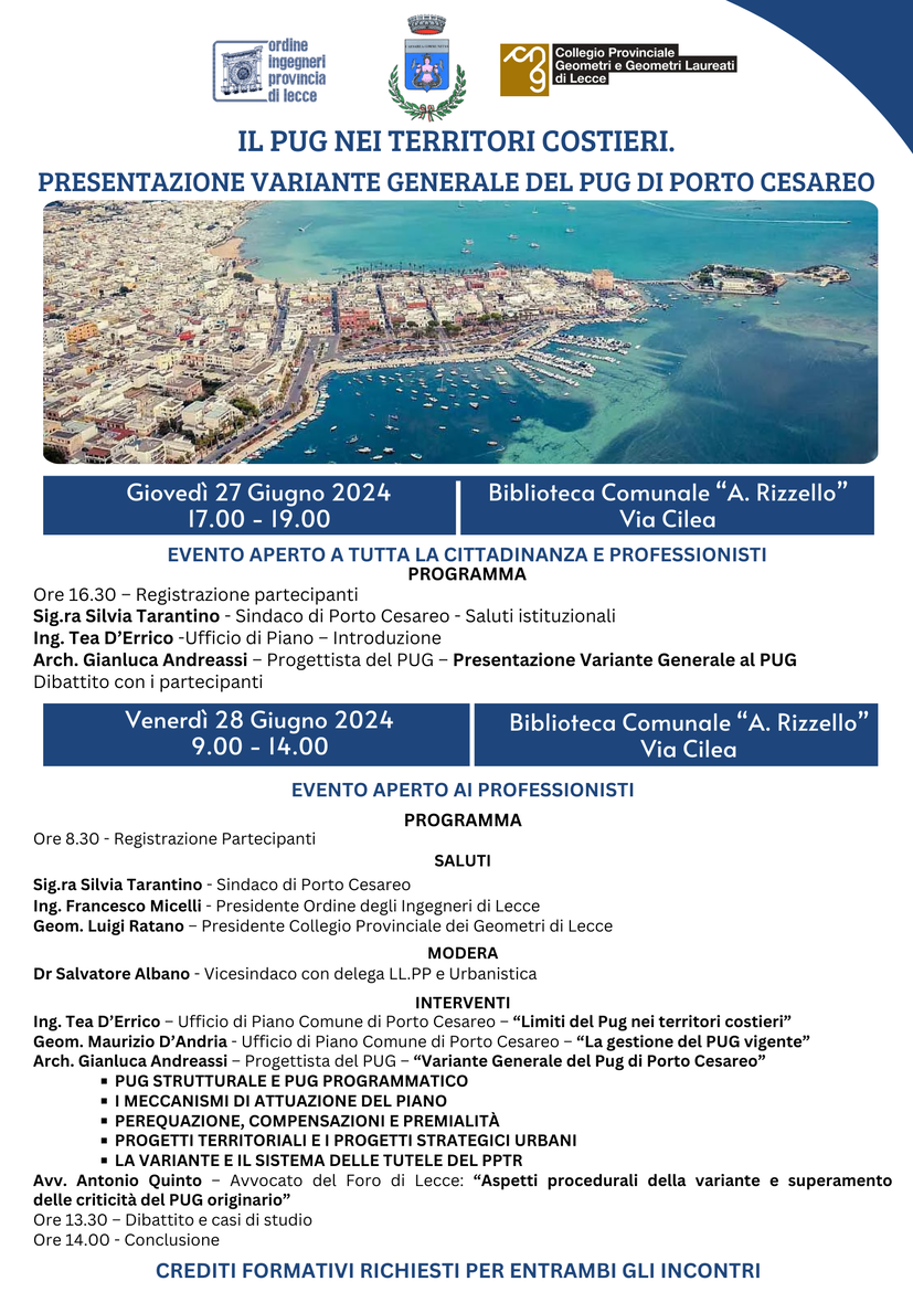 Si avvisa che in data 27 Giugno dalle ore 17.00 alle ore 19.00 e Venerdì 28 Giugno dalle ore 09.00 alle ore 14.00 presso il la Biblioteca Comunale si terrà il Convegno di Presentazione del PUG di Porto Cesareo