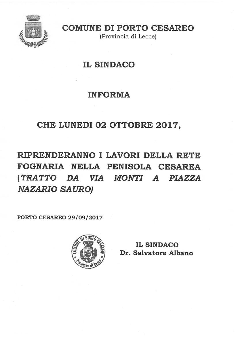 Descrizione IL SINDACO INFORMA CHE LUNEDI 02 OTTOBRE 2017, RIPRENDERANNO I LAVORI DELLA RETE FOGNARIA NELLA PENISOLA CESAREA (TRATTO DA VIA MONTI A PIAZZA NAZARIO SAURO)