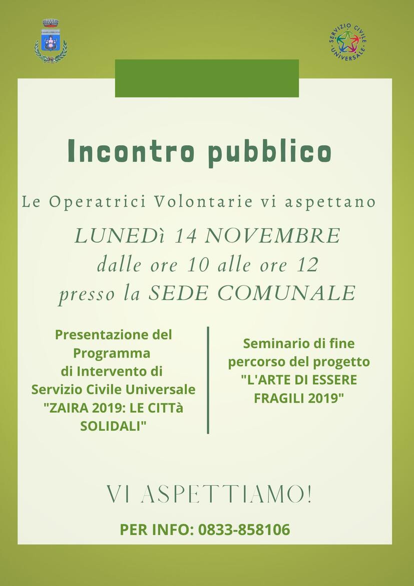 Le operatrici volontarie di servizio civile universale organizzano un Incontro sul programma d’intervento “Zaira 2019: le città solidali” e sul progetto "L'Arte di essere fragili 2019", per illustrare alla cittadinanza gli obiettivi di fine percorso raggiunti.