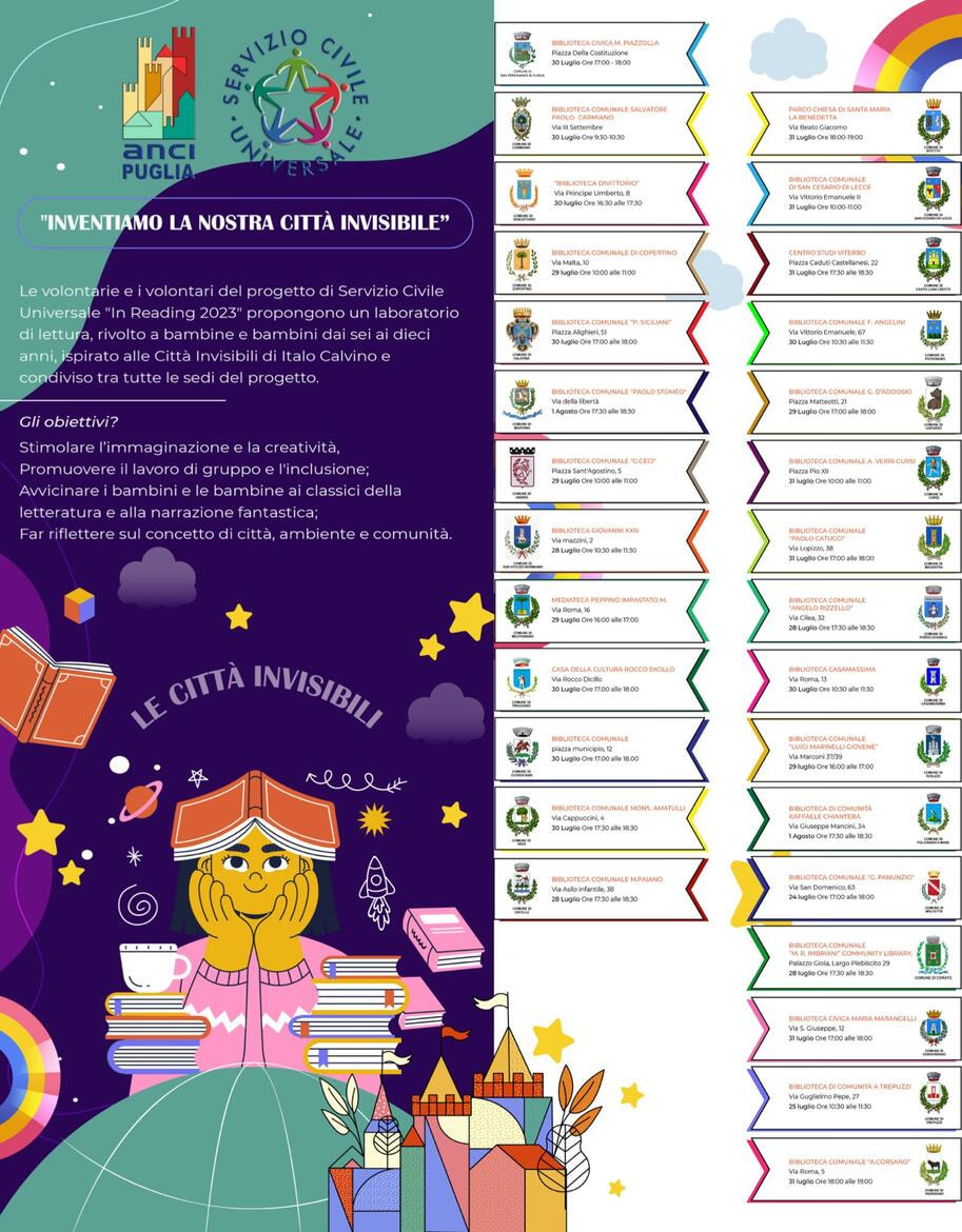 Gli Operatori Volontari del Servizio Civile Universale, nell’ambito del progetto "In Reading 2023", invitano la cittadinanza a partecipare all’evento “Inventiamo la nostra città invisibile”, che si terrà lunedì 28 luglio 2025 alle ore 17:00 presso la Biblioteca Comunale A. Rizzello, via Cilea 32 Porto Cesareo.