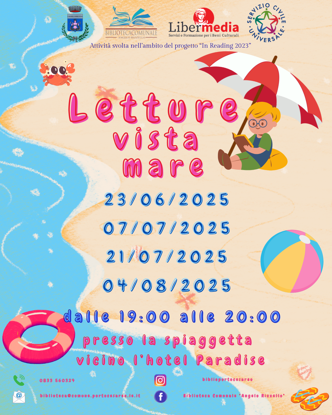 Gli incontri si svolgeranno dalle ore 19:00 alle 20:00 presso la spiaggetta nei pressi dell’Hotel Paradise, in un’atmosfera suggestiva tra suoni del mare e pagine da ascoltare.
