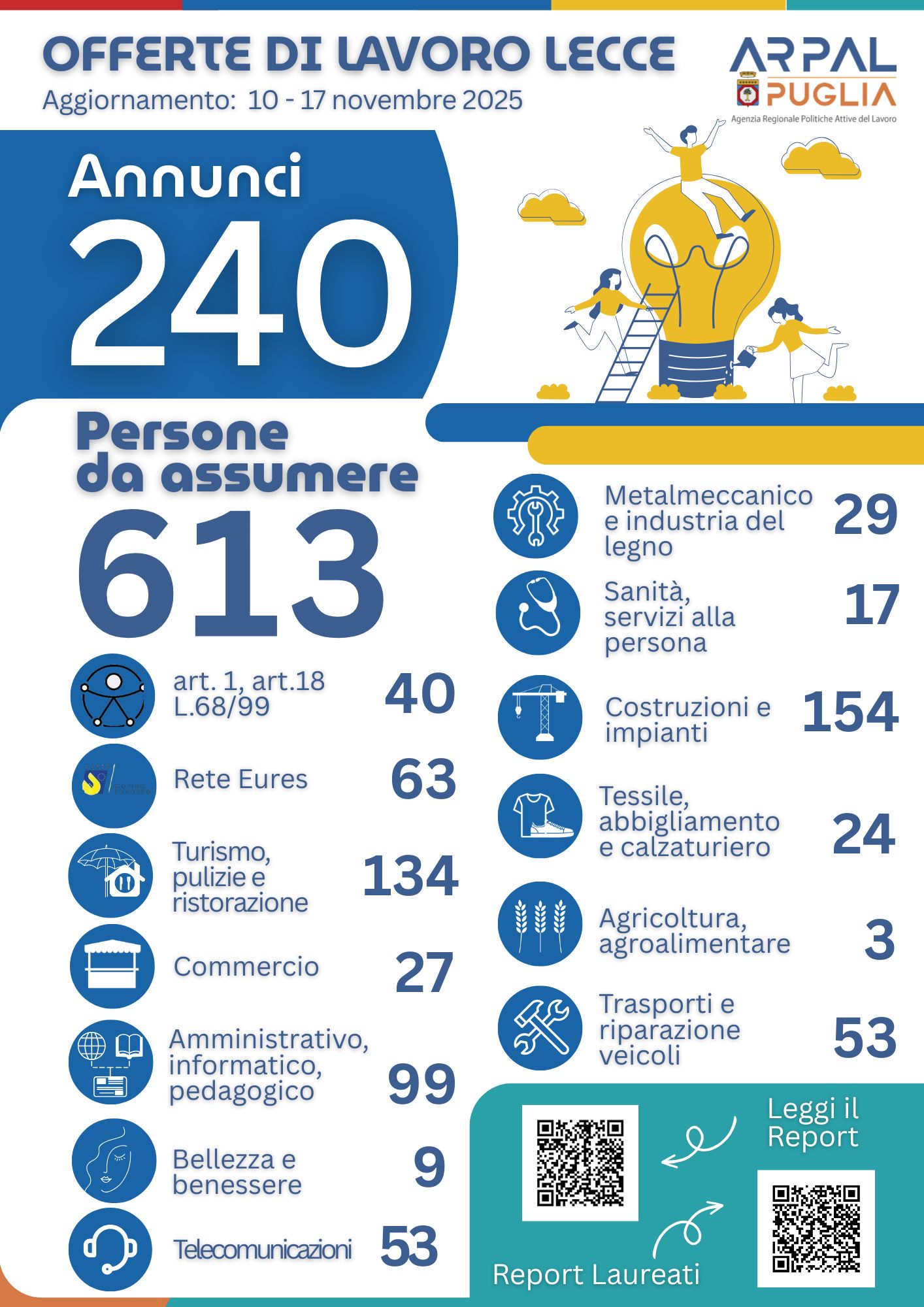 Offerte di lavoro Lecce - 40° Report ARPAL Puglia - dal 10 al 17 novembre 2025